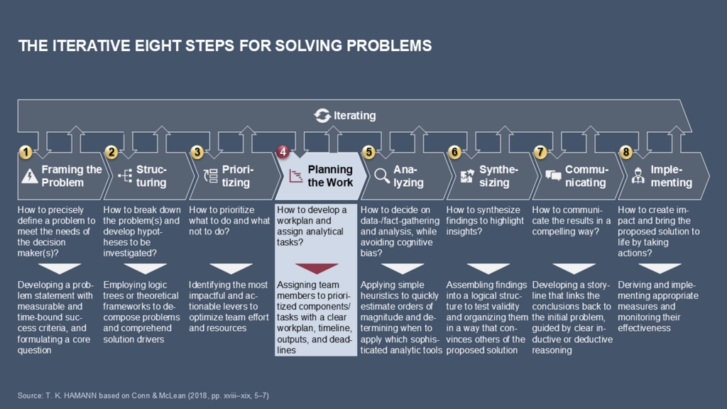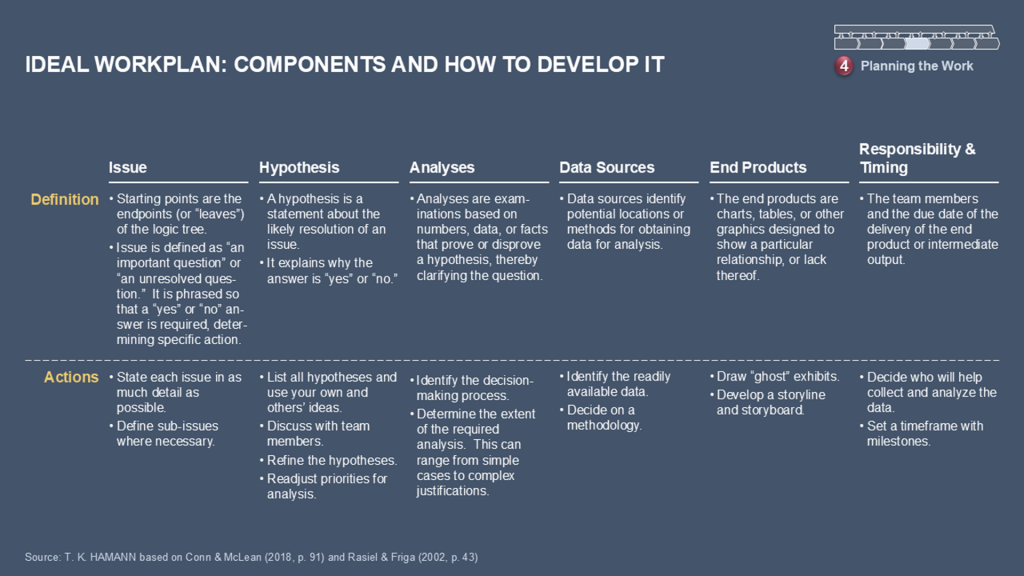 Planning the work ensures that problem solving proceeds in a disciplined, efficient, and transparent way. Without planning, even well-framed and well-structured problems risk being approached haphazardly, leading to wasted effort, missed deadlines, and superficial answers. With planning, teams can agree on clear hypotheses, organize data-gathering efforts, and coordinate individual contributions toward meaningful results.