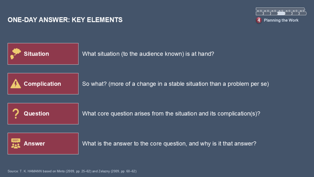 A one-day answer is a summary of the team’s current understanding of the problem; it is usually expressed as a situation, complication, and resolution.